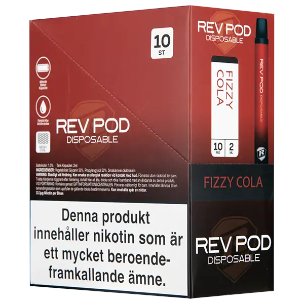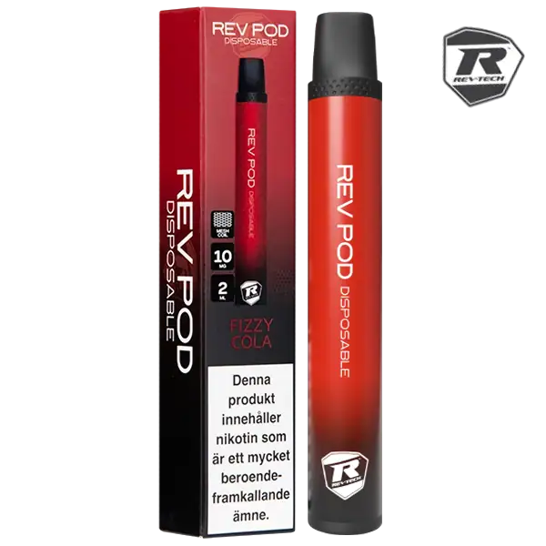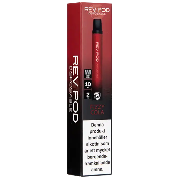 Fizzy Cola innehåller 10 mg/ml nikotin och enheten är rundad och avlång i formen. REV POD enheterna har en silkesmatt yta och ett munstycke som ger användaren en enklare användning. Den är anpassad för både nybörjare och för dig som är van vid att använda vapes.