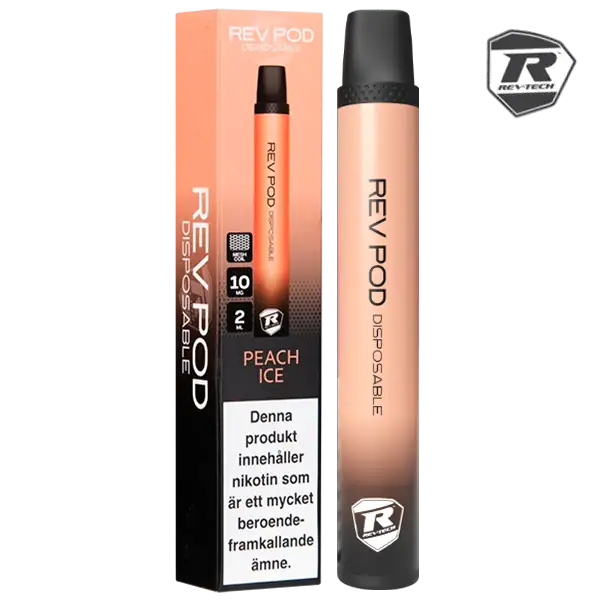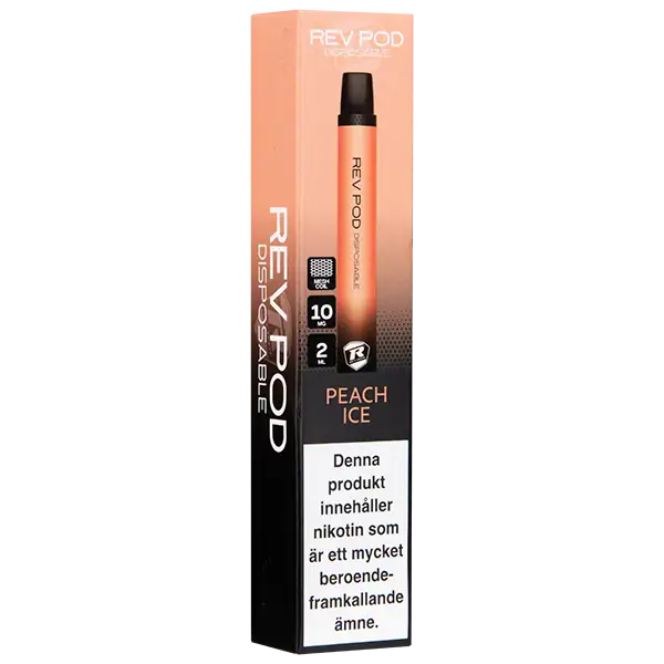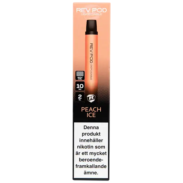 Peach Ice innehåller 10 mg/ml nikotin och enheten är rundad och avlång i formen. REV POD enheterna har en silkesmatt yta och ett munstycke som ger användaren en enklare användning. Den är anpassad för både nybörjare och för dig som är van vid att använda vapes.