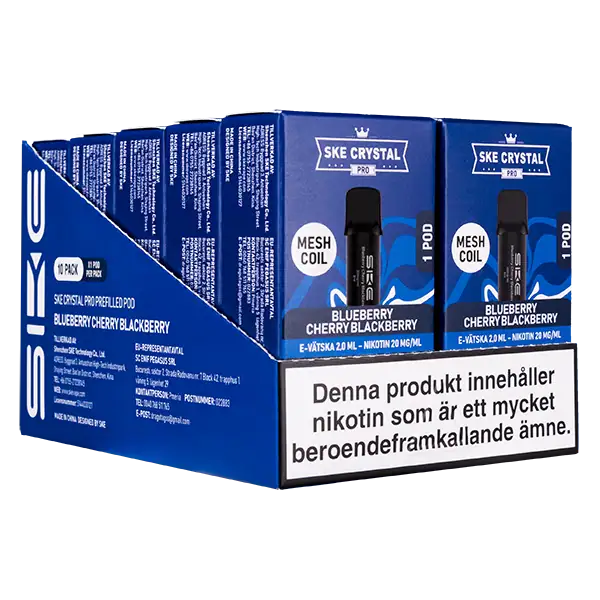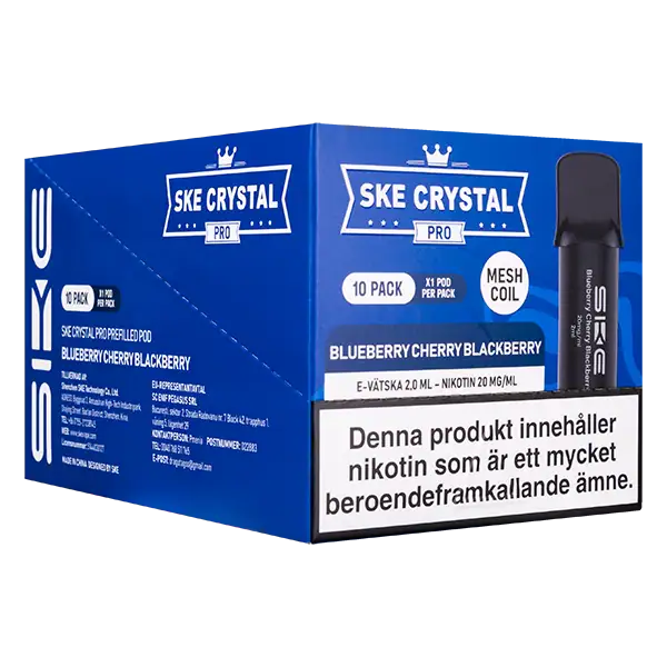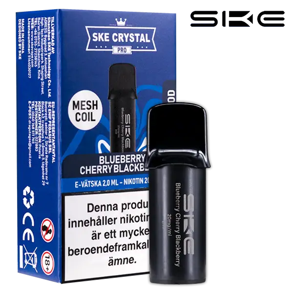 SKE Crystal PRO förfyllda poddar fungerar enbart till SKE Crystal PLUS Max batterier. Podsystemet är uppdelat i två delar, en uppladdningsbar batteridel och förfyllda poddar med 2 ml e-vätska. Batterierna säljs separat per styck och smakpoddarna, såsom SKE Crystal PRO Pod Blueberry Cherry Blackberry 20 mg, säljes separat.