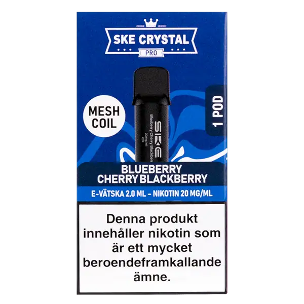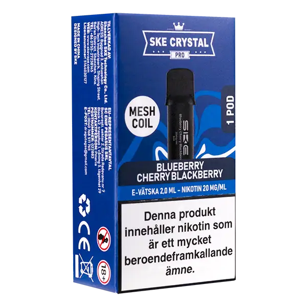 SKE Crystal PRO Pod Blueberry Cherry Blackberry 20 mg är förfyllda poddar som har en tydlig smak av blåbär, körsbär och björnbär.