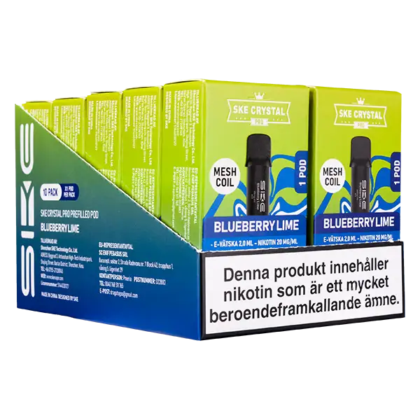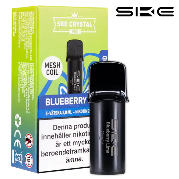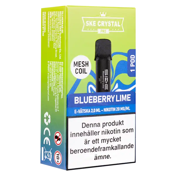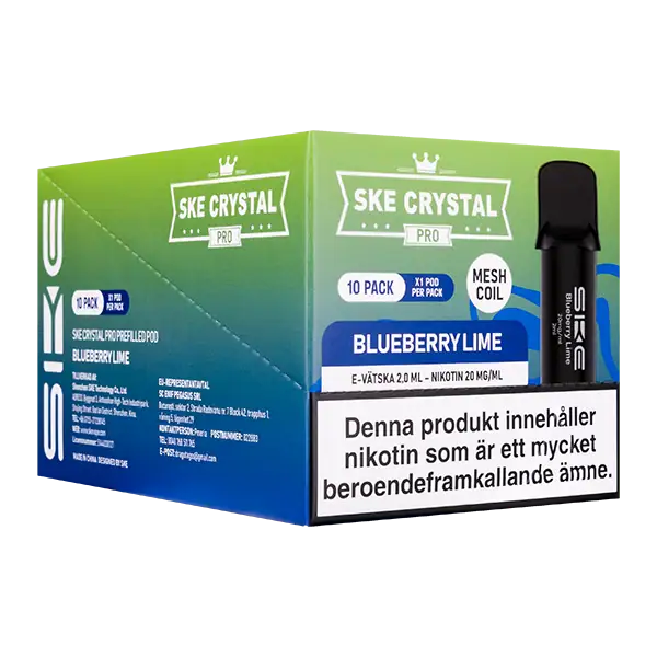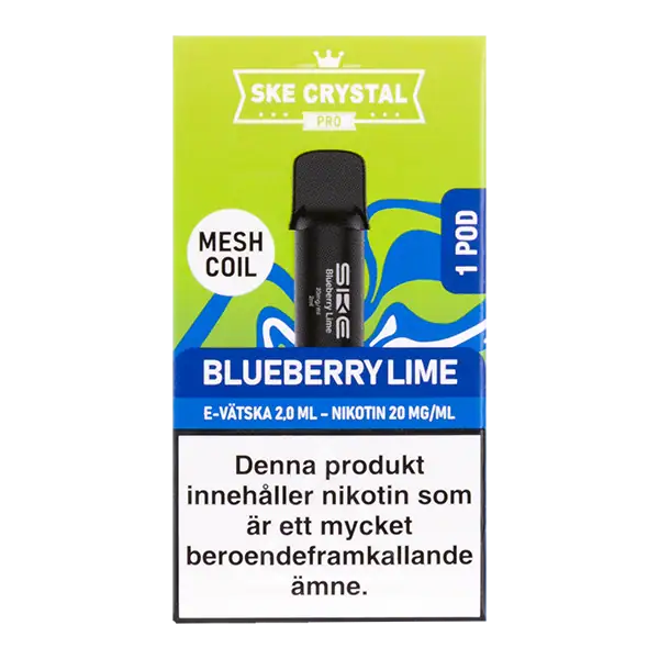 SKE Crystal PRO Pod Blueberry Lime är en förfylld pod med en nikotinhalt på 20 mg. Tydligt profilerad smak av blåbär och lime samt helt fri från tobak.
