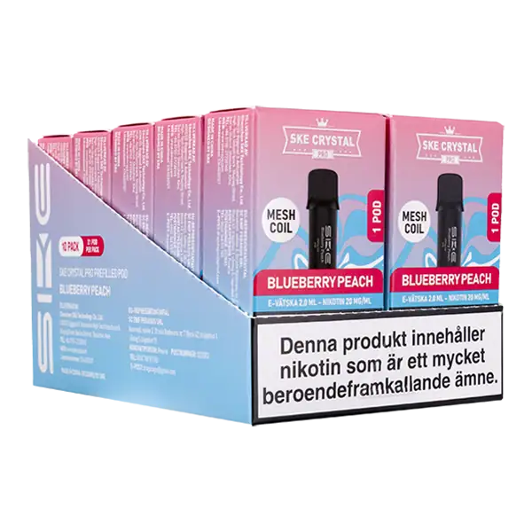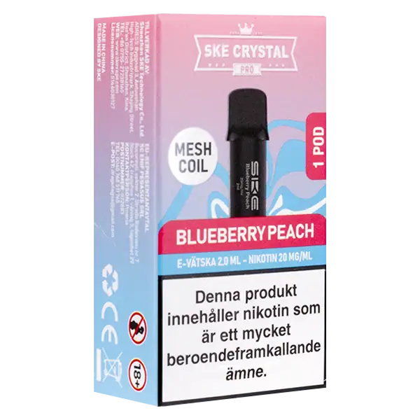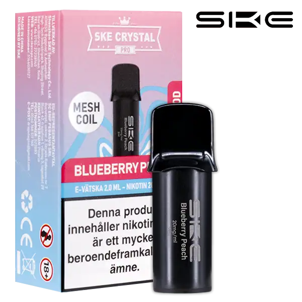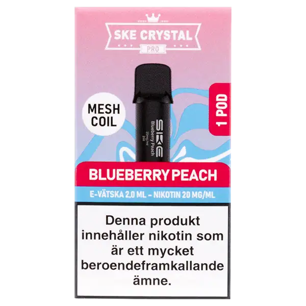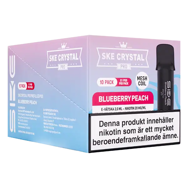 SKE Crystal PRO Pod Blueberry Peach är en förfylld pod med en nikotinhalt på 20 mg. Tydligt profilerad smak av blåbär och persika samt helt fri från tobak.