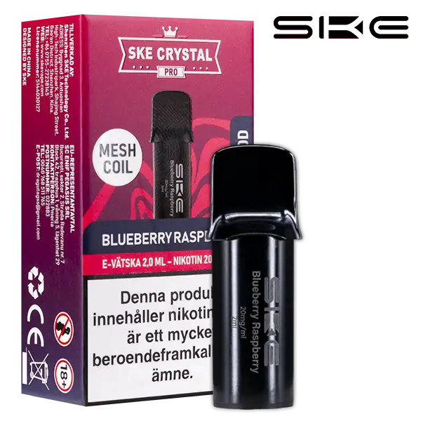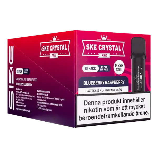 SKE Crystal PRO förfyllda poddar fungerar enbart till SKE Crystal PLUS Max batterier. Podsystemet är uppdelat i två delar, en uppladdningsbar batteridel och förfyllda poddar med 2 ml e-vätska. Batterierna säljs separat per styck och smakpoddarna, såsom SKE Crystal PRO Pod Blueberry Raspberry 20 mg, säljes separat.