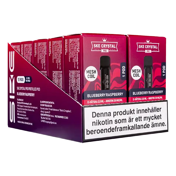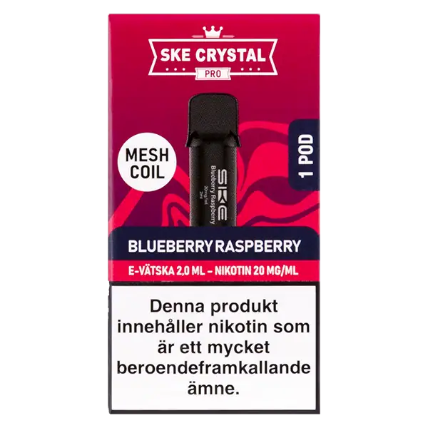 SKE Crystal PRO Pod Blueberry Raspberry är en förfylld pod med en nikotinhalt på 20 mg. Tydligt profilerad smak av blåbär och hallon samt helt fri från tobak.