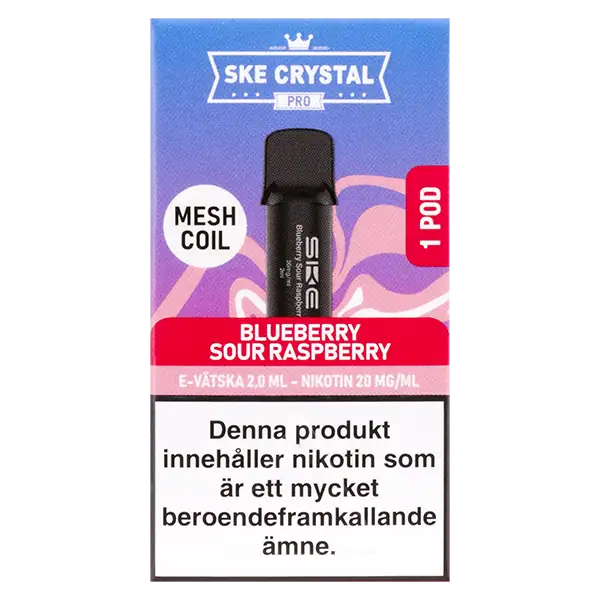 SKE Crystal PRO Pod Blueberry Sour Raspberry 20 mg är förfyllda poddar som har en tydlig smak av blåbär och sur hallon.
