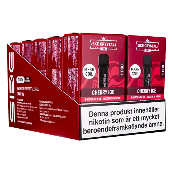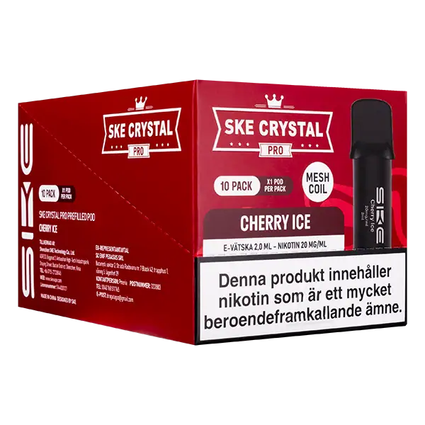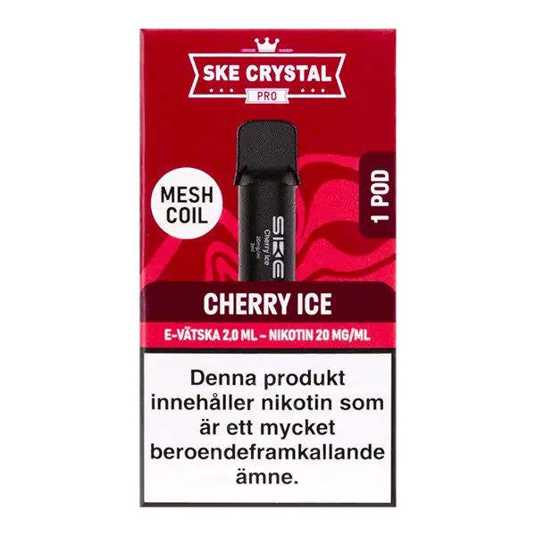 SKE Crystal PRO Pod Cherry Ice är en förfylld pod med en nikotinhalt på 20 mg. Tydligt profilerad smak av körsbär samt helt fri från tobak.