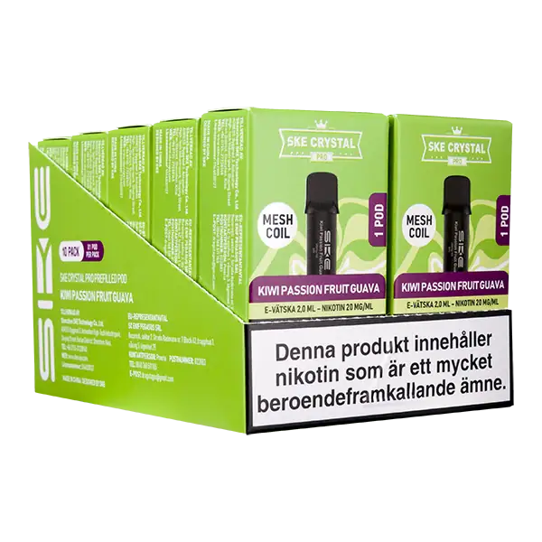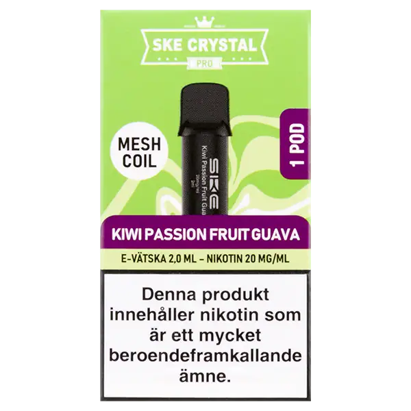 SKE Crystal PRO Pod Kiwi Passion Fruit Guava 20 mg är förfyllda poddar som har en tydlig smak av kiwi, passionsfrukt och guava.