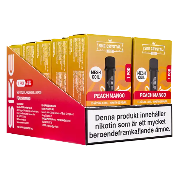 SKE Crystal PRO Pod Peach Mango 20 mg är förfyllda poddar som har en tydlig smak av persika och mango.
