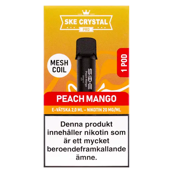 SKE Crystal PRO Pod Peach Mango är en förfylld pod med en nikotinhalt på 20 mg. Tydligt profilerad smak av persika och mango samt helt fri från tobak.