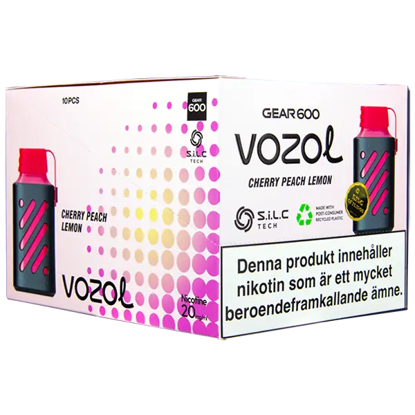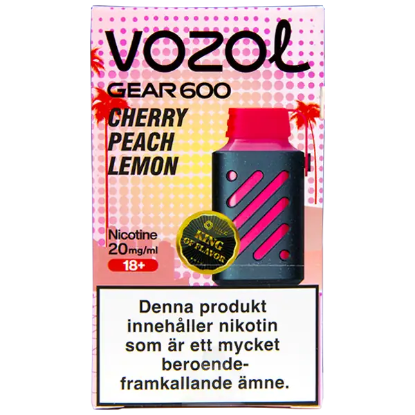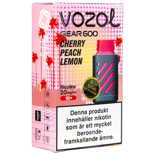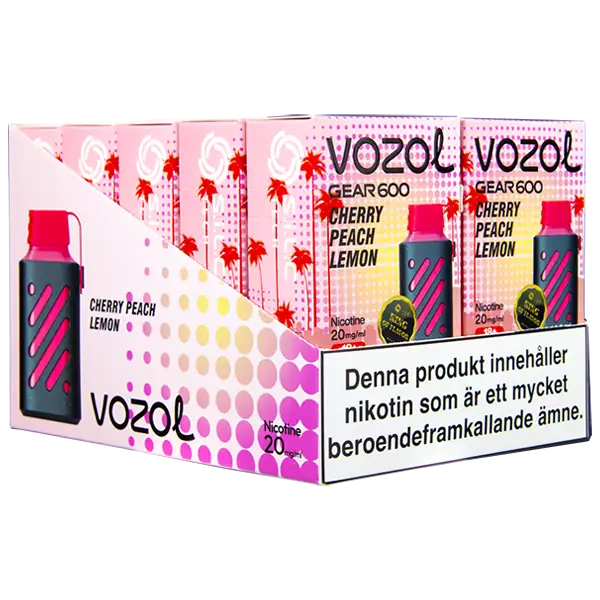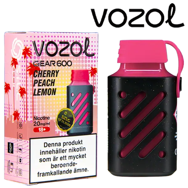 VOZOL Gear 600 Cherry Peach Lemon 20 mg är en engångsvape från VOZOL med 20 mg/ml nikotin som har en tydlig och en lätt kylande smak av körsbär, persika och citron.