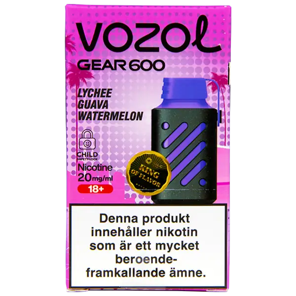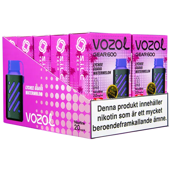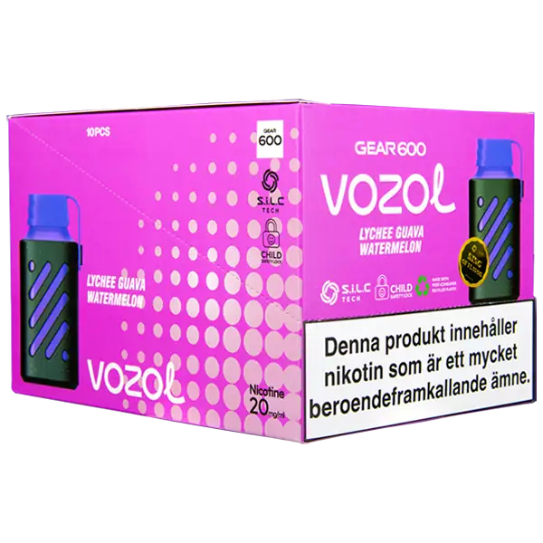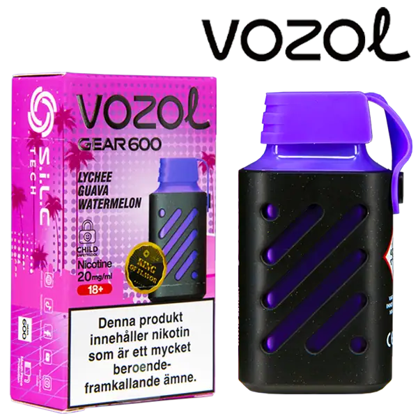 VOZOL Gear 600 Lychee Guava Watermelon är en elektronisk engångscigarett från VOZOL. Enheten innehåller nikotin som kommer påfylld med 2 ml e-juice. Lychee Guava Watermelon har tydliga smakämnen av litchi, guava och vattenmelon. Engångsvapen har en exklusiv och unik design med det separata munstycket av gummi.