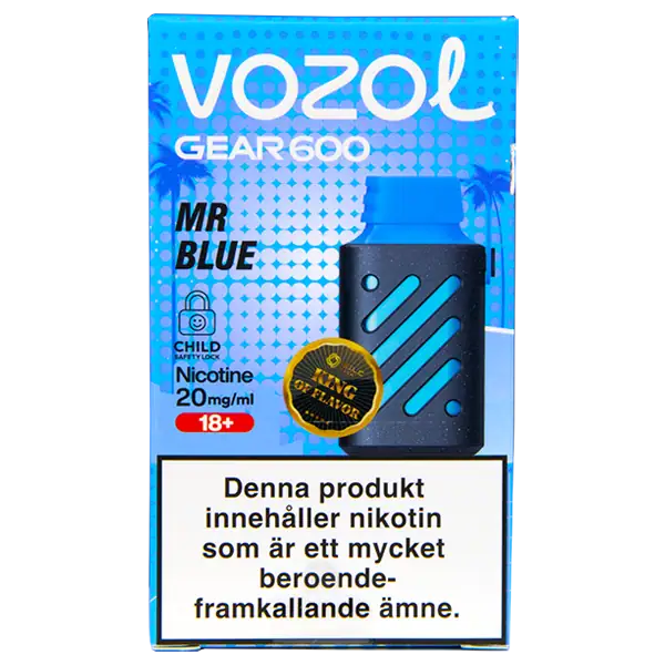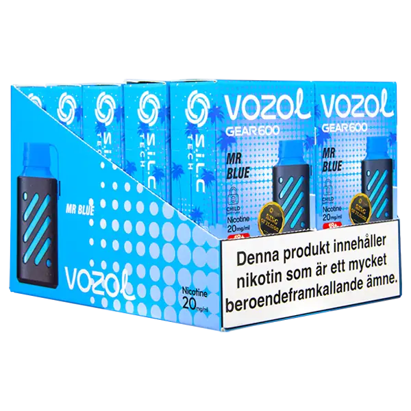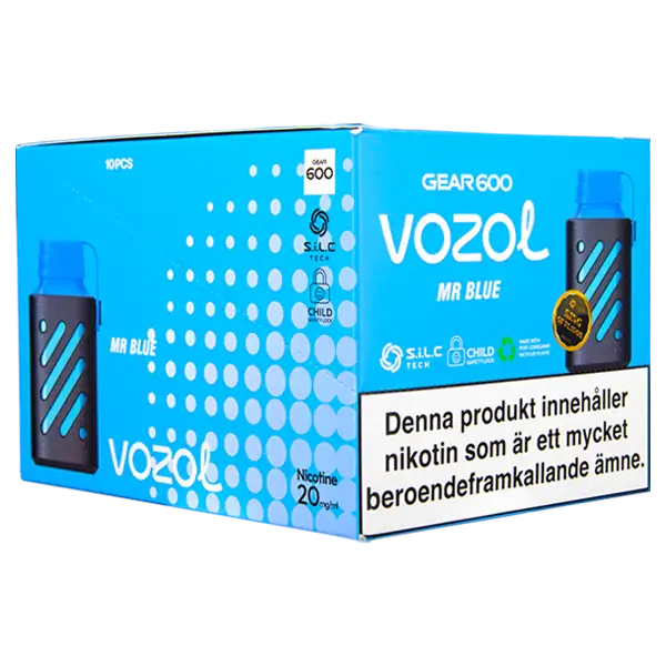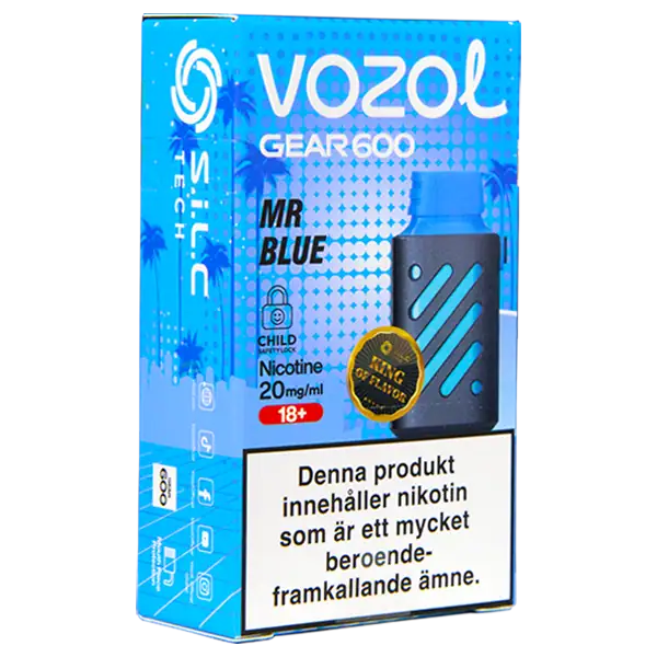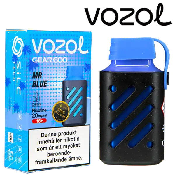 VOZOL Gear 600 Mr Blue är en elektronisk engångscigarett från VOZOL. Enheten innehåller nikotin som kommer påfylld med 2 ml e-juice. Mr Blue har tydliga smakämnen av blandade bär och mentol. Engångsvapen har en exklusiv och unik design med det separata munstycket av gummi.