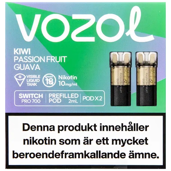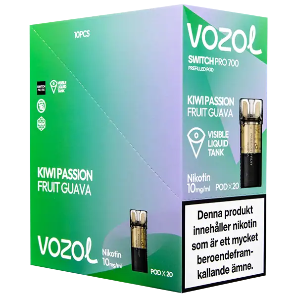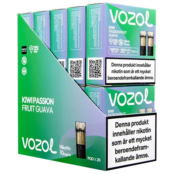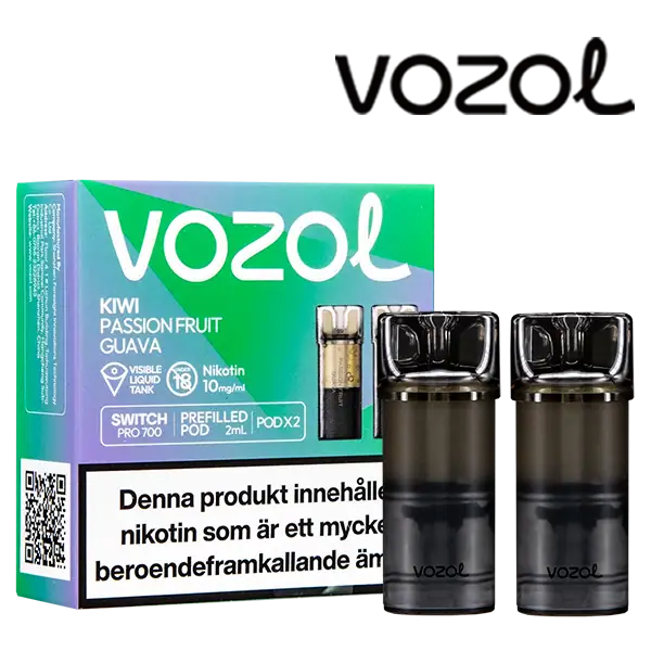 Kiwi Passionfruit Guava är speciellt designade för att passa VOZOL serien av podsystem. De förfyllda poddarna är tillverkade av plast och höljet av poddarna är svarta. Poddarna från VOZOL är förfyllda poddar med 2 ml e-juice som man sätter i sin batterienhet. När podden tar slut så kan du byta pod i din batterienhet. Poddarna ska sorteras som elektronisk utrustning på en avfallsanläggning efter användning.