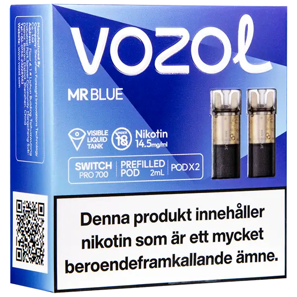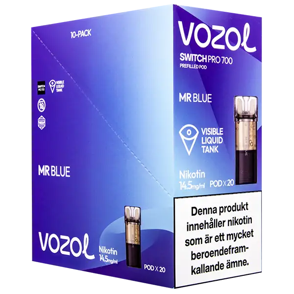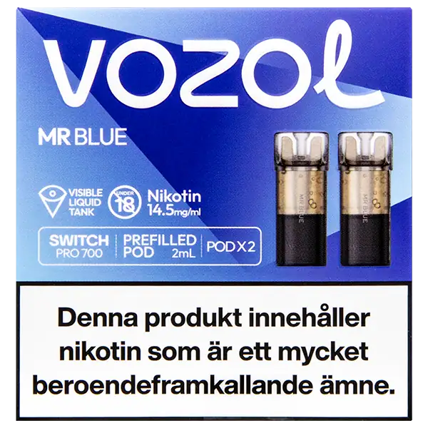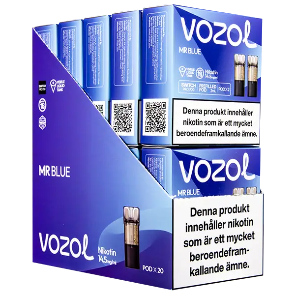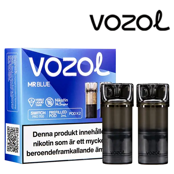 Mr Blue är speciellt designade för att passa VOZOL serien av podsystem. De förfyllda poddarna är tillverkade av plast och höljet av poddarna är svarta. Poddarna från VOZOL är förfyllda poddar med 2 ml e-juice som man sätter i sin batterienhet. När podden tar slut så kan du byta pod i din batterienhet. Poddarna ska sorteras som elektronisk utrustning på en avfallsanläggning efter användning.