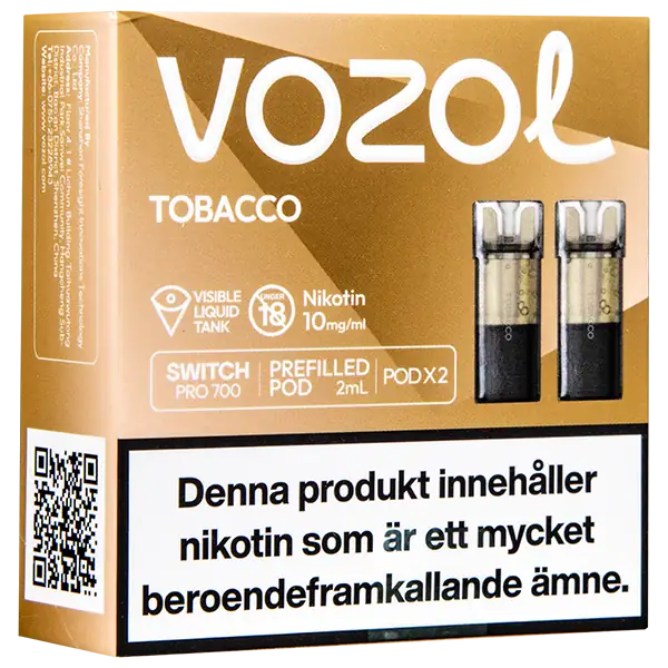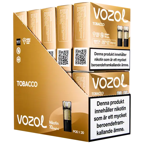 Tobacco är speciellt designade för att passa VOZOL serien av podsystem. De förfyllda poddarna är tillverkade av plast och höljet av poddarna är svarta. Poddarna från VOZOL är förfyllda poddar med 2 ml e-juice som man sätter i sin batterienhet. När podden tar slut så kan du byta pod i din batterienhet. Poddarna ska sorteras som elektronisk utrustning på en avfallsanläggning efter användning.