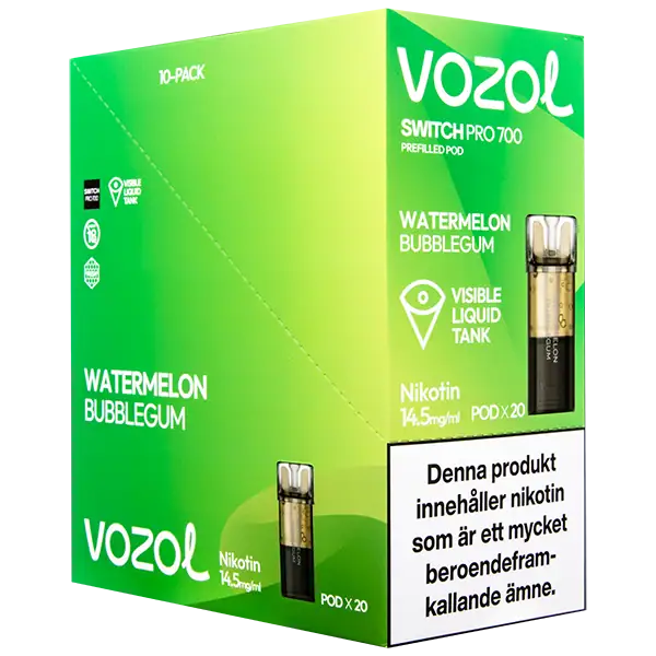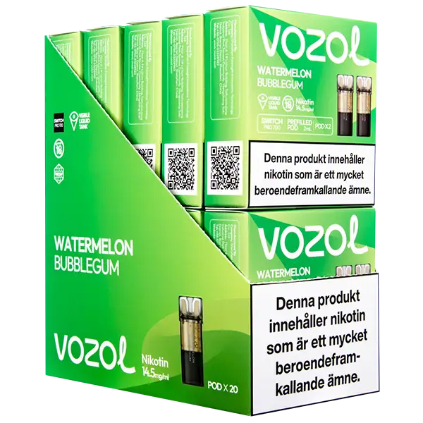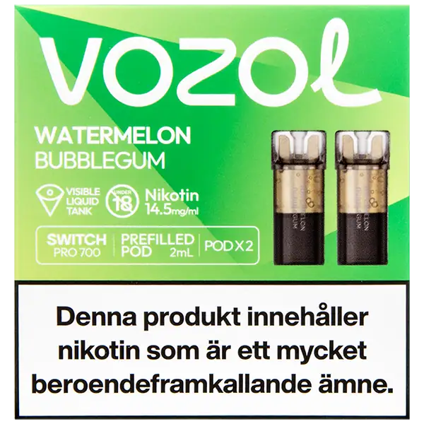 VOZOL Pod Watermelon Bubblegum 14.5 mg är en förfylld podd med nikotin som kommer påfylld med 2 ml e-juice per pod. VOZOL Pod Watermelon Bubblegum har smakämnen av vattenmelon och tuggummi, dessutom ger dessa poddar upp till hela 700 puffar per pod. VOZOL Pod Watermelon Bubblegum 14.5 mg innehåller 14.5 mg/ml.