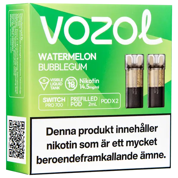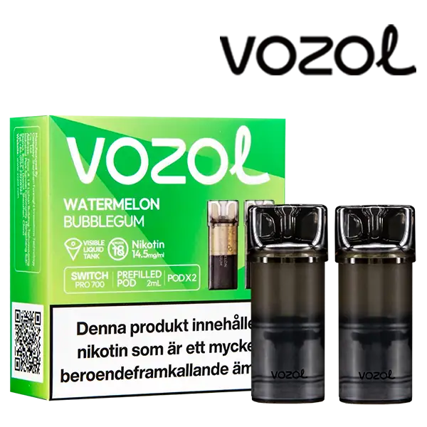 Watermelon Bubblegum är speciellt designade för att passa VOZOL serien av podsystem. De förfyllda poddarna är tillverkade av plast och höljet av poddarna är svarta. Poddarna från VOZOL är förfyllda poddar med 2 ml e-juice som man sätter i sin batterienhet. När podden tar slut så kan du byta pod i din batterienhet. Poddarna ska sorteras som elektronisk utrustning på en avfallsanläggning efter användning.