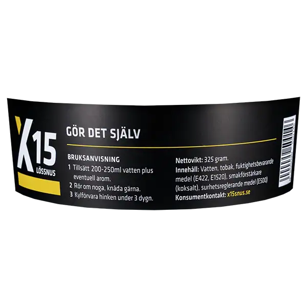 Produkten X-15 Express Lössnus är väldigt lätt att färdigställa. För att få ett färdigt snus krävs ingen värmebehandling. Du tillsätter ca 200-250 ml liter vatten i hinken och vispar om och knådar. Smaksätt gärna med någon arom såsom hos X-15 Express Lössnus. När du gjort detta så ska snuset kylförvaras under tre dygn så suger snuskornen åt sig vätskan och smakerna fördelas jämt i snuset.